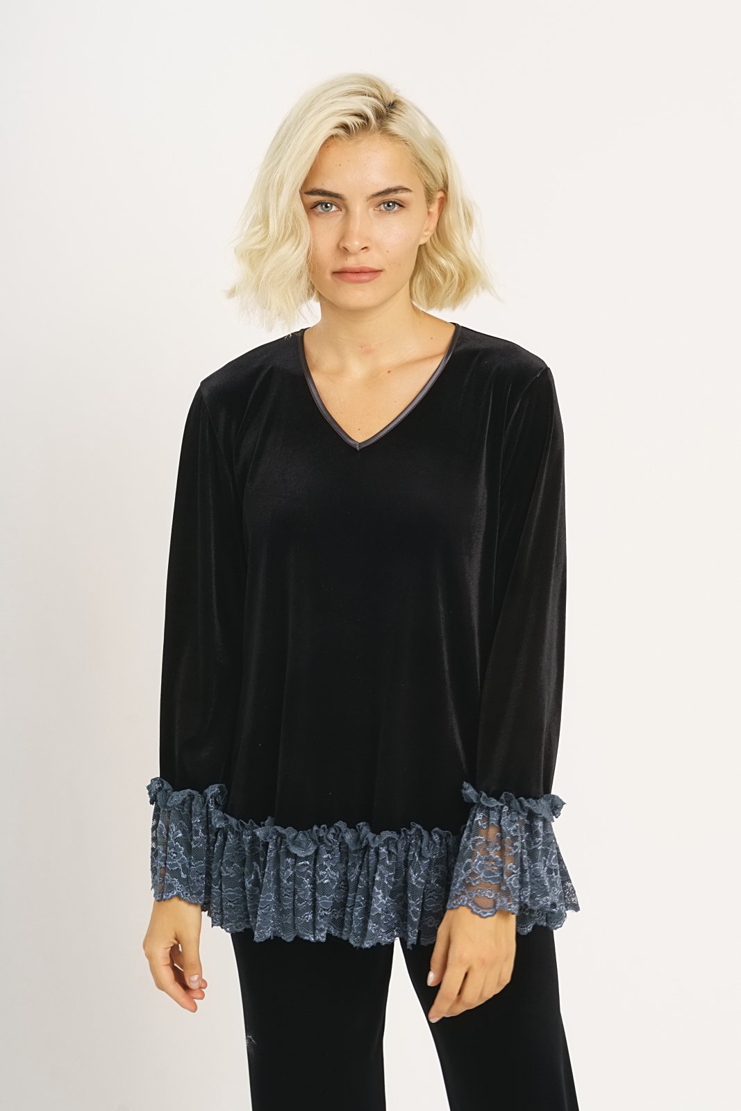To σετ διατίθεται με V λαιμόκοψη και λεπτομέρειες από δαντέλα στις μανσέτες και στον ποδόγυρο της μπλούζας και μονόχρωμο παντελόνι.