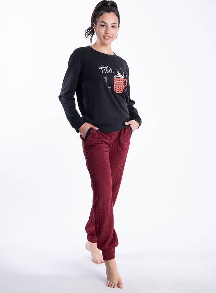 Χειμωνιάτικη γυναικεία πυζάμα με ζεστό μπορντώ παντελόνι με στάμπα φλιτζάνι καφέ!